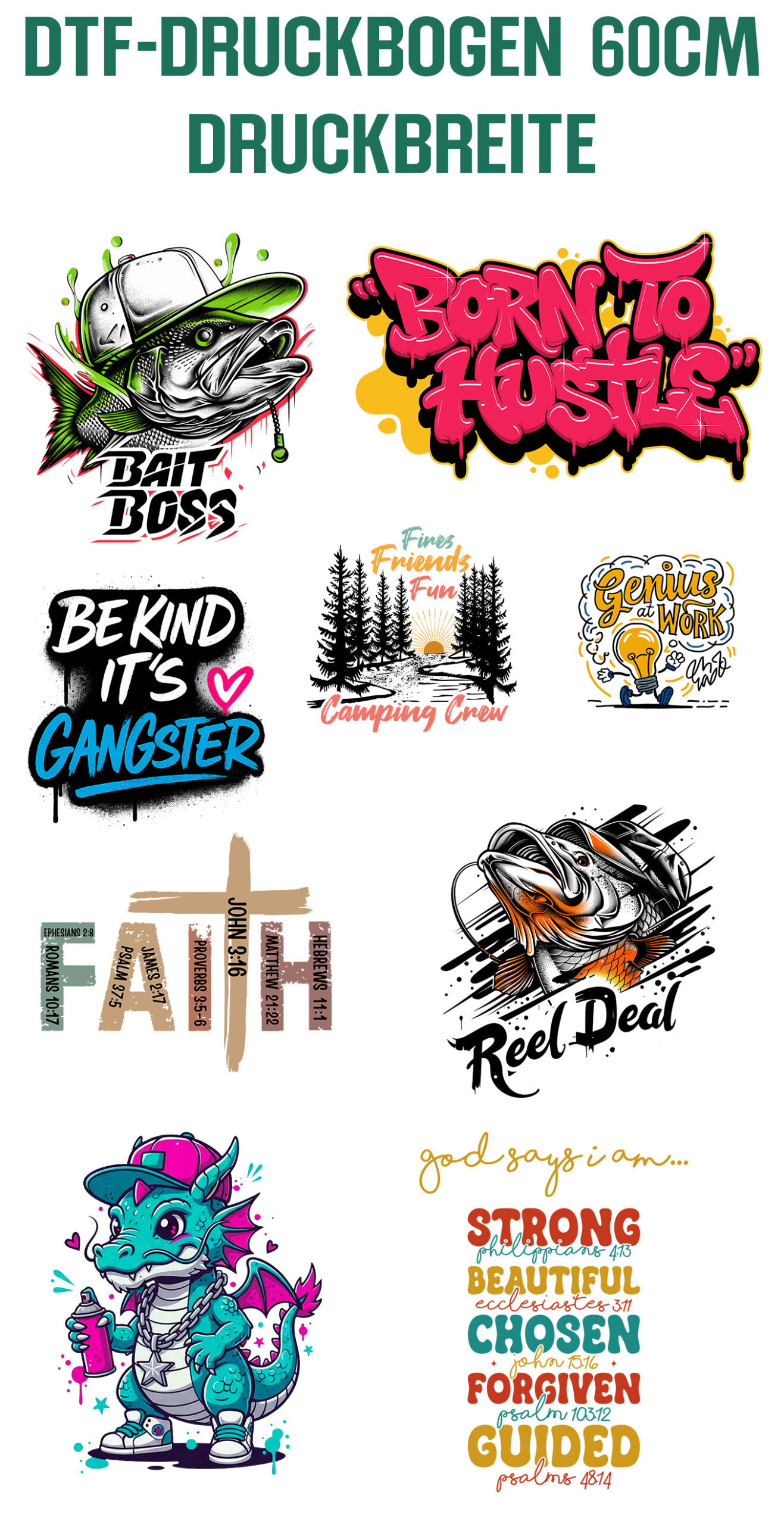 DTF-Druckbögen 60 cm auf Dual Peel-Folie für Profi-Textildruck. Brillante Farben, hohe Waschbeständigkeit, ideal für Baumwolle, Polyester & Mischgewebe. Erstellen Sie jetzt Ihren eigenen DTF-Druckbogen mit Ihren Motiven, Designs oder Texten. Bestellmenge 60x50cm
